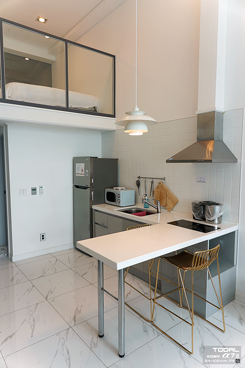 입구 좌측에 화장실(샤워 가능)이 있고 바로 주방이 있다.