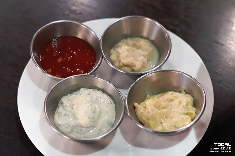 씨푸드 플래터에 제공되는 소스 4종