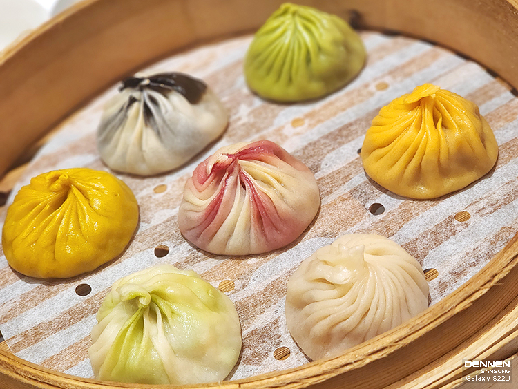 바질 소롱포(녹색) : 시금치즙으로 물들인 소롱포피에 신선한 바질을 곁들였습니다.