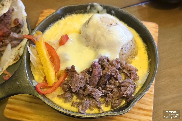 멕시칼리 멕시코 지역에서 인기만점인 사이드 메뉴 베이크 포테이토와 멜팅 치즈, 양파, 소고기의 완벽한 조화