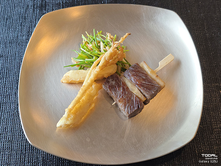 저온숙성 한우등심, 관자구이와 구운 야채, 명이장아찌